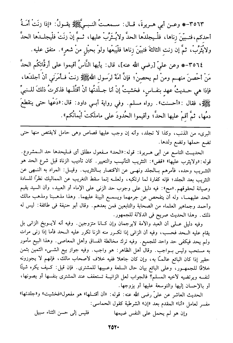 3564 - وعن علي [رضي الله عنه]، قال: يأيها الناس أقيموا علي أرقائكم الحد من أحصن منهم ومن لم يحصن؛ فإن أمة لرسول الله صلى الله عليه وسلم زنت فأمرني أن أجلدها، فإذا هي حديث عهد بنفاس، فخشيت إن أنا جلدتها أن أقتلها فذكرت ذلك للنبي صلى الله عليه وسلم، فقال: ((أحسنت)). رواه مسلم. وفي رواية أبي داود: قال: ((دعها حتى ينقطع دمها، ثم أقم عليه الحد؛ وأقيموا الحدود علي ما ملكت أيمانكم)).