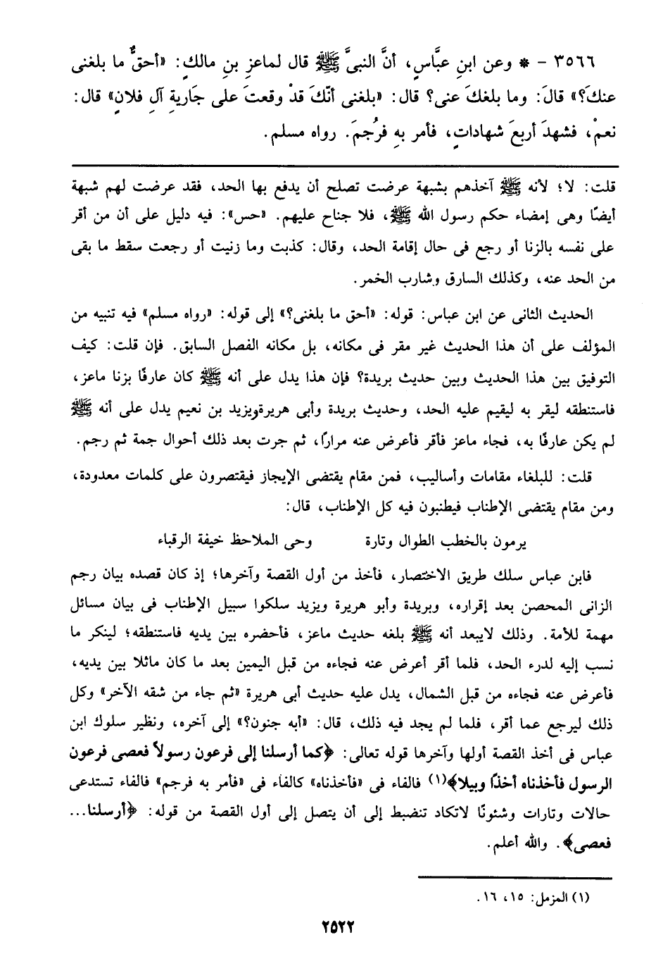 الحديث الثاني عن ابن عباس: قوله: ((أحق ما بلغني؟)) إلي قوله: ((رواه مسلم)) فيه تنبيه من المؤلف علي أن هذا الحديث غير مقر في مكانه، بل مكانه الفصل السابق. فإن قلت: كيف التوفيق بين هذا الحديث وبين حديث بريدة؟ فإن هذا يدل علي أنه صلى الله عليه وسلم كان عارفاً بزنا ماعز، فاستنطقه ليقر به ليقيم عليه الحد، وحديث بريدة وأبي هريرة ويزيد بن نعيم يدل علي أنه صلى الله عليه وسلم لم يكن عارفاً به، فجاء ماعز فأقر فأعرض عنه مراراً، ثم جرت بعد ذلك أحوال جمة ثم رجم.