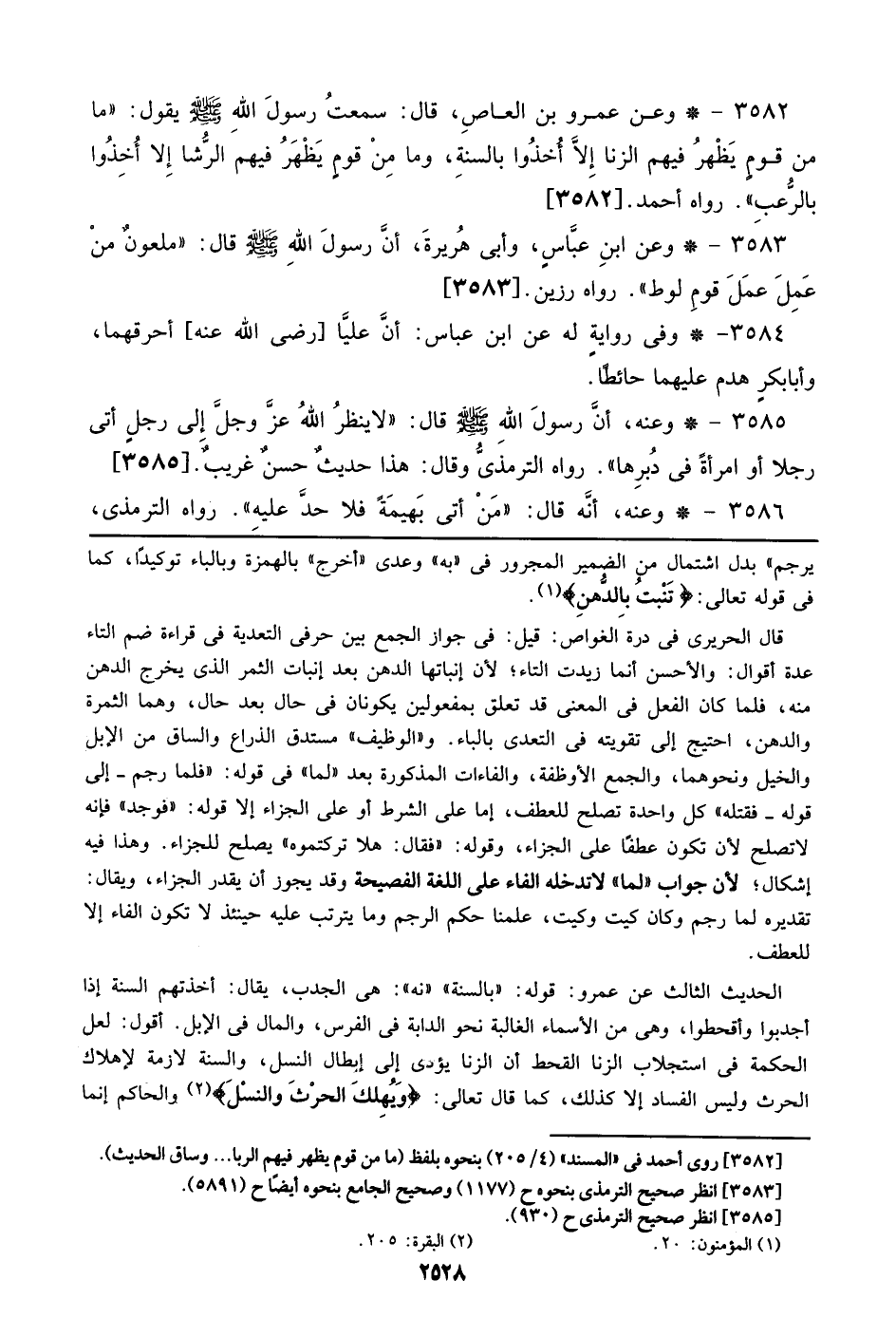 3582 - وعن عمرو بن العاص، قال: سمعت رسول الله صلى الله عليه وسلم يقول: ((ما من قوم يظهر فيهم الزنا إلا أخذوا بالسنة، وما من قوم يظهر فيهم الرشا إلا أخذوا بالرعب)). رواه أحمد. [3582]