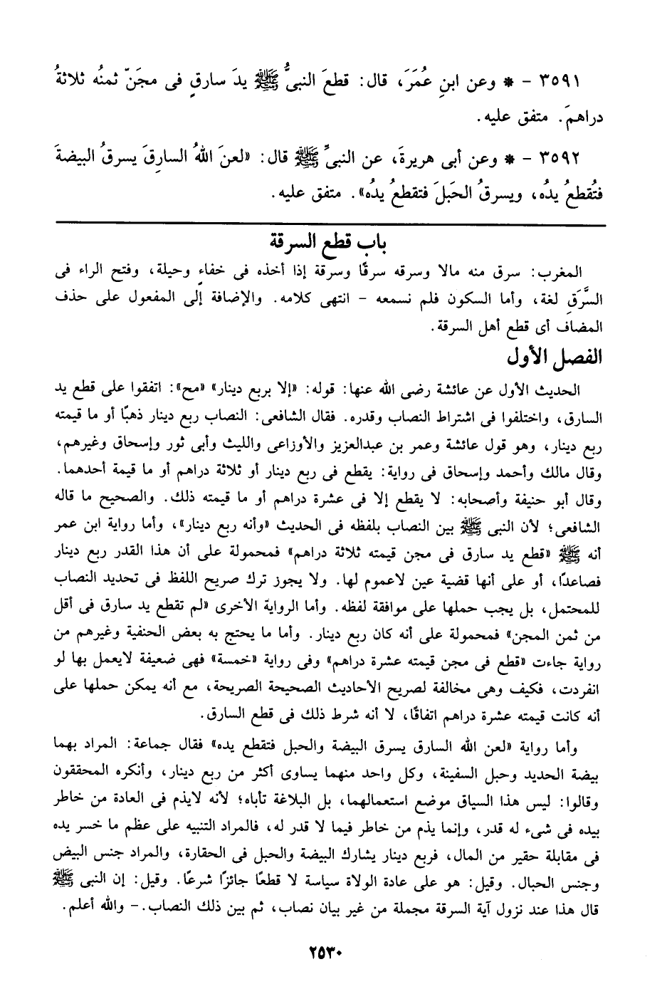 3592 - وعن أبي هريرة، عن النبي صلى الله عليه وسلم قال: ((لعن الله السارق يسرق البيضة فتقطع يده، ويسرق الحبل فتقطع يده)). متفق عليه.