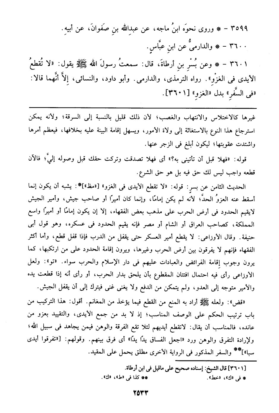 3601 - وعن بسر بن أرطاة، قال: سمعت رسول الله صلى الله عليه وسلم يقول: ((لا تقطع الأيدي في الغزو)). رواه الترمذي، والدارمي. وأبو داود، والنسائي، إلا أنهما قالا: ((في السفر)) بدل ((الغزو)) [3601].