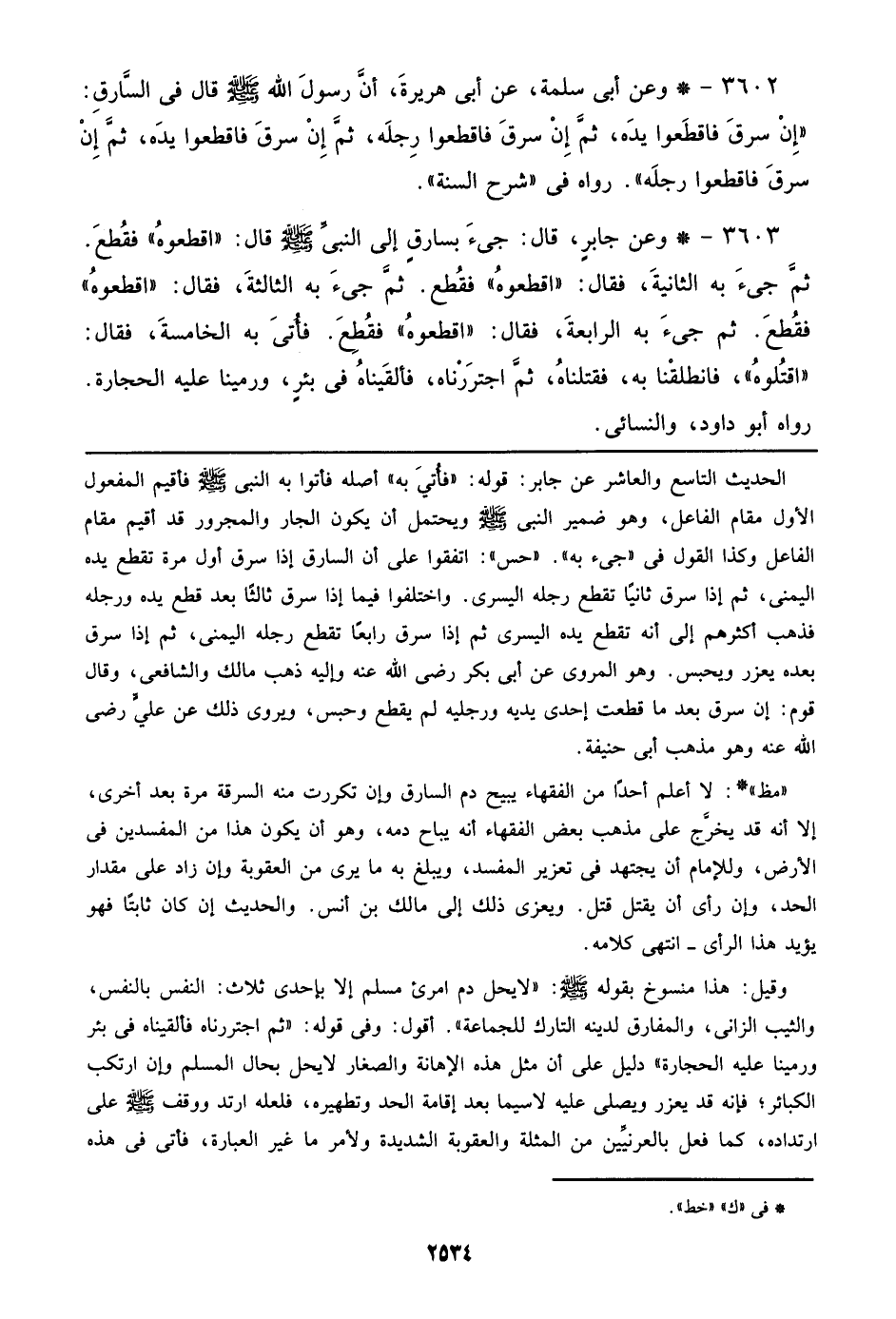 ((مظ)): لا أعلم أحداً من الفقهاء يبيح دم السارق وإن تكررت منه السرقة مرة بعد أخرى، إلا أنه قد يخرج علي مذهب بعض الفقهاء أنه يباح دمه، وهو أن يكون هذا من المفسدين في الأرض، وللإمام أن يجتهد في تعزير المفسد، ويبلغ به ما يرى من العقوبة وإن زاد علي مقدار الحد، وإن رأي أن يقتل قتل. ويعزى ذلك إلي مالك بن أنس. والحديث إن كان ثابتاً فهو يؤيد هذا الرأي – انتهي كلامه.