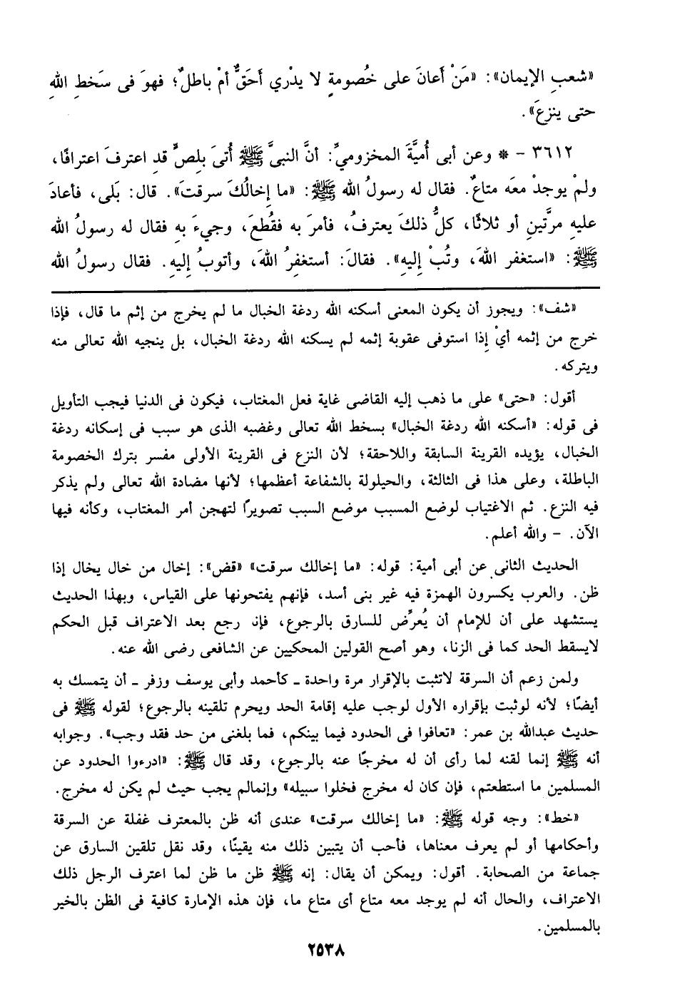 3612 - وعن أبي أمية المخزومي: أن النبي صلى الله عليه وسلم أتى بلص قد اعترف اعترافاً، ولم يوجد معه متاع. فقال له رسول الله صلى الله عليه وسلم: ((ما إخالك سرقت)). قال: بلي، فأعاد عليه مرتين أو ثلاثاً، كل ذلك يعترف، فأمر به فقطع، وجيء به فقال له رسول الله صلى الله عليه وسلم: ((استغفر الله، وتب إليه)). فقال: استغفر الله، وأتوب إليه، فقال رسول الله