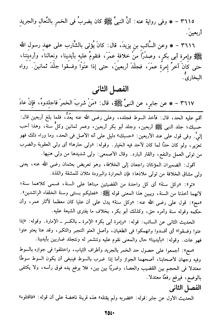 3616 - وعن السائب بن يزيد، قال: كان يؤتى بالشارب علي عهد رسول الله صلى الله عليه وسلم وإمرة أبي بكر، وصدراً من خلافة عمر، فنقوم عليه بأيدينا، ونعالنا، وأرديتنا، حتى كان آخر إمرة عمر، فجلد أربعين، حتى إذا عتوا وفسقوا جلد ثمإنين. رواه البخاري.