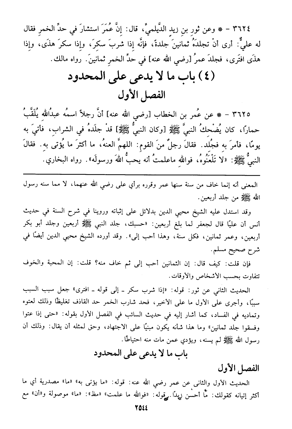 3624 - وعن ثور بن زيد الديلمي، قال: إن عمر استشار في حد الخمر فقال له علي: أرى أن تجلده ثمإنين جلدة، فإنه إذا شرب سكر، وإذا سكر هذى، وإذا هذى افترى، فجلد عمر [رضي الله عنه] في حد الخمر ثمإنين. رواه مالك.