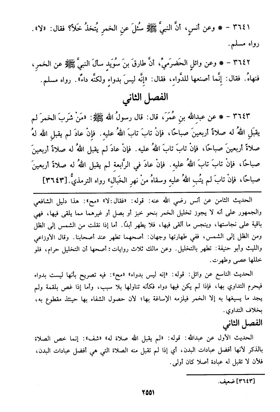 3643 - عن عبد الله بن عمر، قال: قال رسول الله صلى الله عليه وسلم: ((من شرب الخمر لم يقبل الله له صلاة أربعين صباحاً، فإن تاب تاب الله عليه. فإن عاد لم يقبل الله له صلاة أربعين صباحاً، فإن تاب تاب الله عليه. فإن عاد لم يقبل الله له صلاة أربعين صباحاً، فإن تاب تاب الله عليه. فإن عاد في الرابعة لم يقبل الله له صلاة أربعين صباحاً، فإن تاب لم يتب الله عليه وسقاه من نهر الخبال)) رواه الترمذي. [3643]