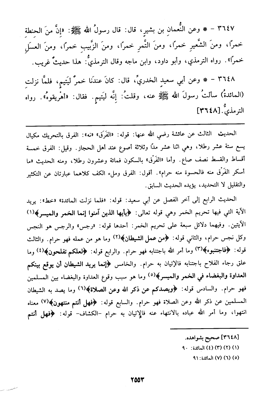 الحديث الرابع إلي آخر الفصل عن أبي سعيد: قوله: ((فلما نزلت المائدة)) ((خط)): يريد الآية التي فيها تحريم الخمر وهي قوله تعالي: {يَا أَيُّهَا الَّذِينَ آمَنُوا إنَّمَا الخَمْرُ والمَيْسِرُ} الآيتين. وفيهما دلائل سبعة علي تحريم الخمر: أحدها قوله: ((رجس)) والرجس هو النجس وكل نجس حرام، والثاني قوله: {مِنْ عَمَلِ الشَّيْطَانِ} وما هو من عمله فهو حرام. والثالث قوله: {فَاجْتَنِبُوهُ} وما أمر الله باجتنابه فهو حرام. والرابع قوله: {لَعَلَّكُمْ تُفْلِحُونَ} وما علق رجاء الفلاح باجتنابه فالإتيان به حرام. والخامس {إنَّمَا يُرِيدُ الشَّيْطَانُ أَن يُوقِعَ بَيْنَكُمُ العَدَاوَةَ والْبَغْضَاءَ فِي الخَمْرِ والْمَيْسِرِ} وما هو سبب وقوع العداوة والبغضاء بين المسلمين فهو حرام. والسادس قوله: {ويَصُدَّكُمْ عَن ذِكْرِ اللَّهِ وعَنِ الصَّلاةِ} وما يصد به الشيطان المسلمين عن ذكر الله وعن الصلاة فهو حرام. والسابع قوله: {فَهَلْ أَنتُم مُّنتَهُونَ} معناه انتهوا، وما أمر الله عباده بالانتهاء عنه فالإتيان به حرام – الكشاف – قوله: {فَهَلْ أَنتُم