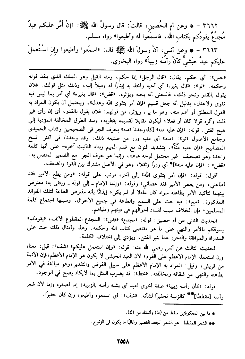 الحديث الثاني عن أم حصين: قوله: ((مجدع)) ((قض)): المجدع المقطوع الأنف، ((يقودكم)) يسوقكم بالأمر والنهي علي ما هو مقتضى كتاب الله وحكمه. وهذا وأمثال ذلك حث علي المداراة والموافقة والتحرز عما يثير الفتن، ويؤدي إلي اختلاف الكلمة.