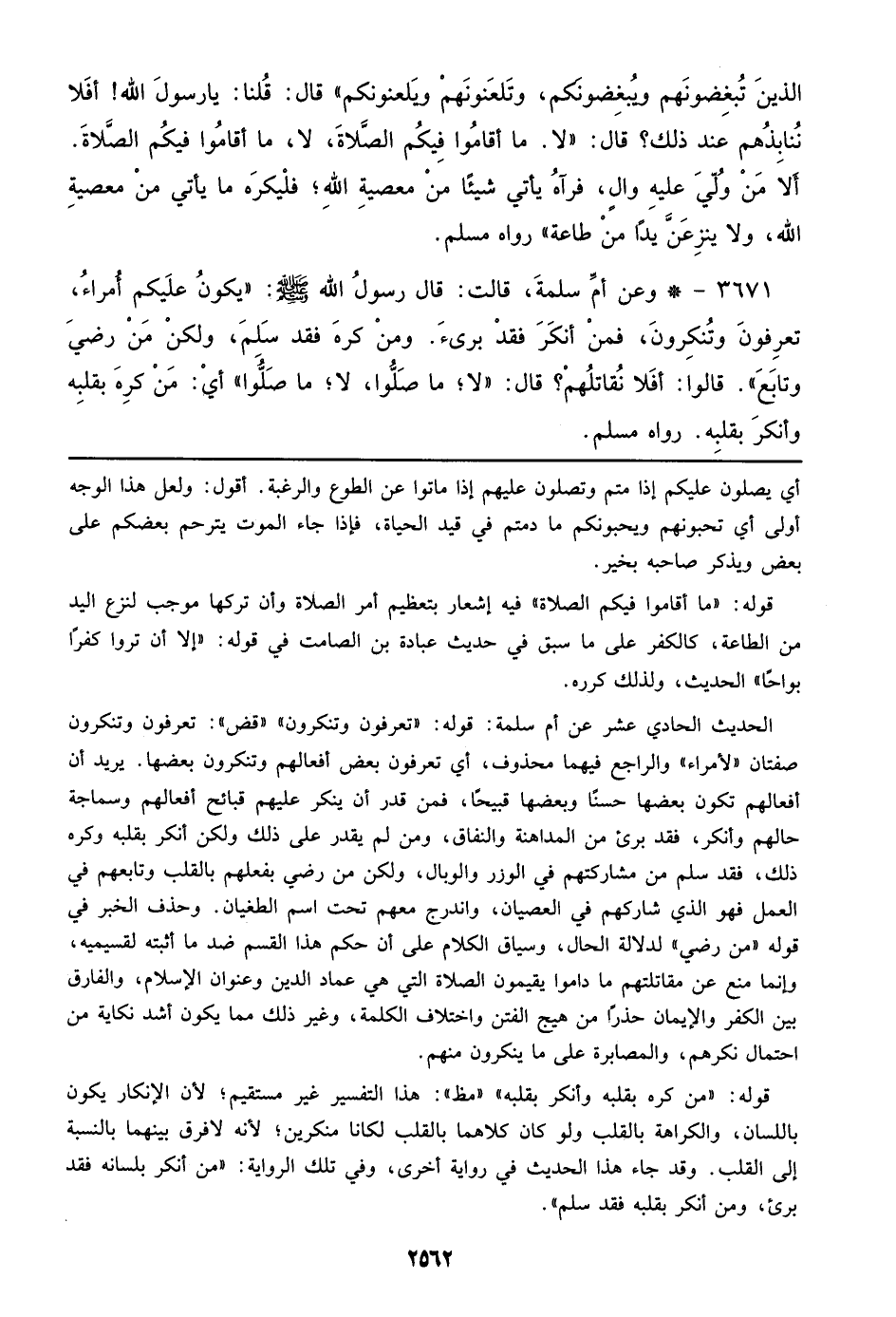 3671 - وعن أم سلمة، قالت: قال رسول الله صلى الله عليه وسلم: ((يكون عليكم أمراء، تعرفون وتنكرون، فمن أنكر فقد برئ. ومن كره فقد سلم، ولكن من رضي وتابع)). قالوا: أفلا نقاتلهم؟ قال: ((لا؛ ما صلوا، لا؛ ما صلوا)) أي: من كره بقلبه وأنكر بقلبه. رواه مسلم.