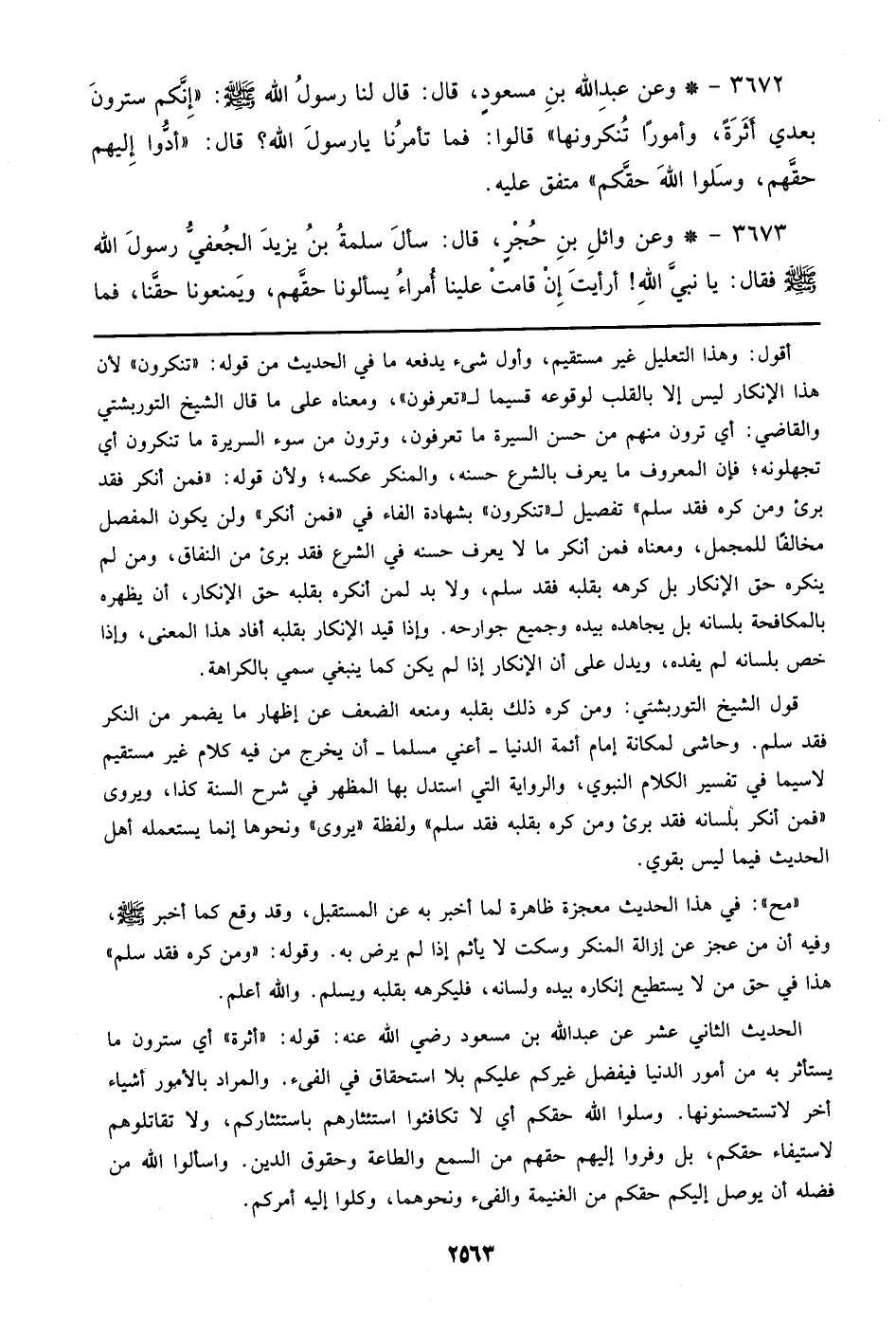 الحديث الثاني عشر عن عبد الله بن مسعود رضي الله عنه: قوله: ((أثرة)) أي سترون ما يستأثر به من أمور الدنيا فيفضل غيركم عليكم بلا استحقاق في الفيء. والمراد بالأمور أشياء أخر لا تستحسنونها. وسلوا الله حقكم أي لا تكافئوا استئثارهم باستئثاركم، ولا تقاتلوهم لاستيفاء حقكم، بل وفروا إليهم حقهم من السمع والطاعة وحقوق الدين. واسألوا الله من فضله أن يوصل إليكم حقكم من الغنيمة والفيء ونحوهما، وكلوا إليه أمركم.