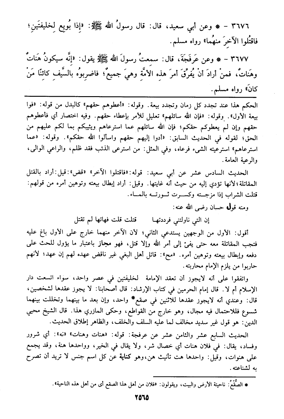 3676 - وعن أبي سعيد، قال: قال رسول الله صلى الله عليه وسلم: ((إذا بويع لخليفتين؛ فاقتلوا الآخر منهما)). رواه مسلم.