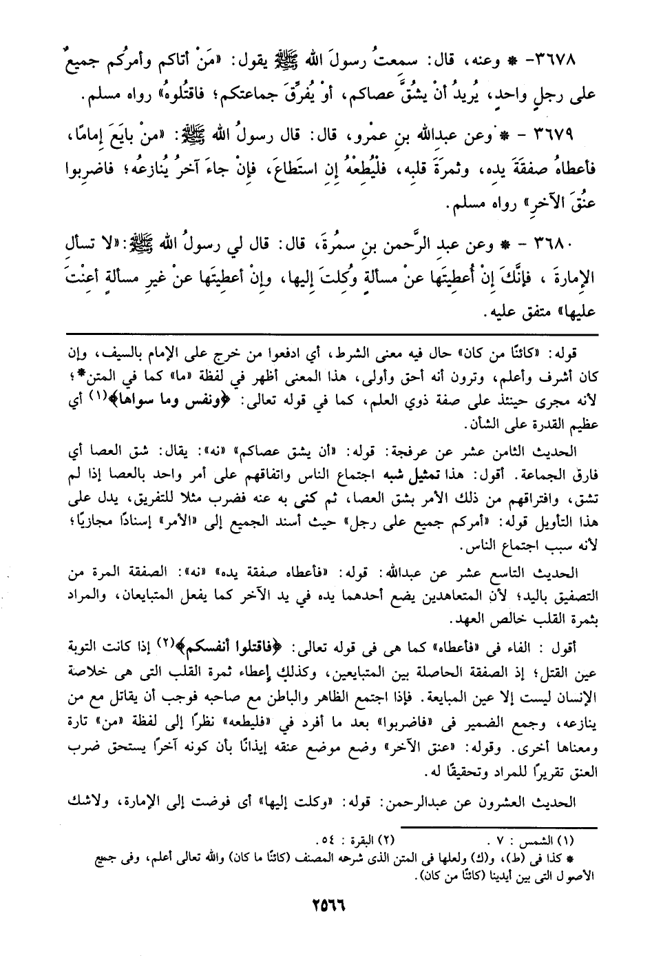 3679 - وعن عبد الله بن عمرو، قال: قال رسول الله صلى الله عليه وسلم: ((من بايع إماماً، فأعطاه صفقة يده، وثمرة قلبه، فليطعه إن استطاع، فإن جاء آخر ينازعه؛ فاضربوا عنق الآخر)) رواه مسلم.