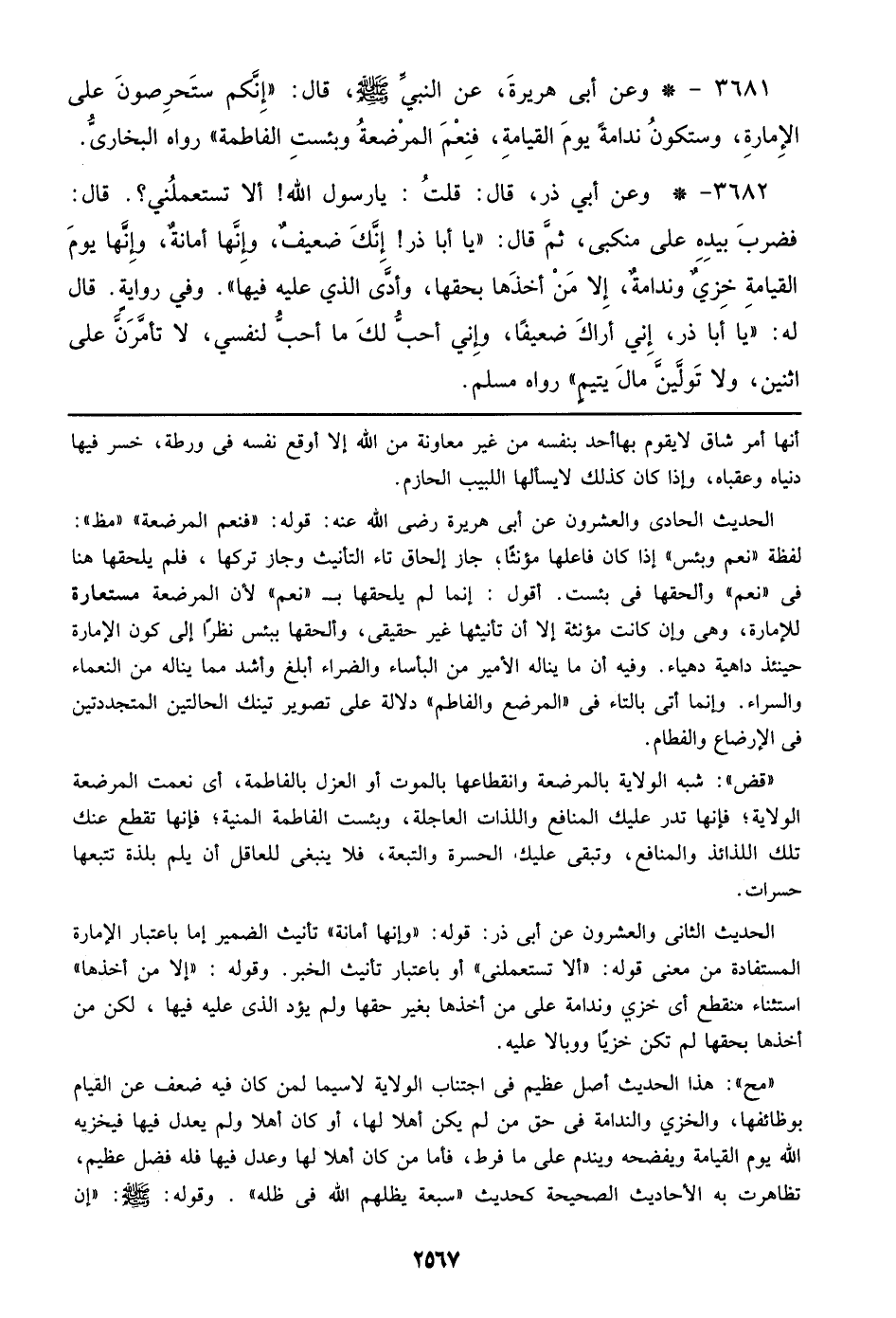 3681 - وعن أبي هريرة، عن النبي صلى الله عليه وسلم، قال: ((إنكم ستحرصون علي الإمارة، وستكون ندامة يوم القيامة، فنعم المرضعة وبئست الفاطمة)) رواه البخاري.