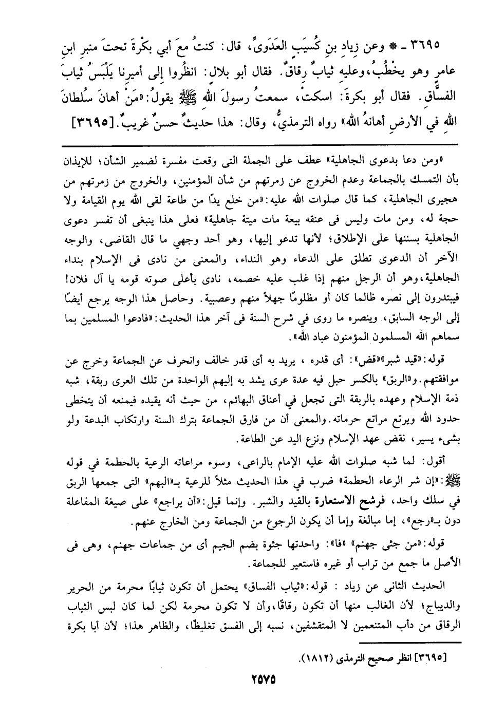3695 - وعن زياد بن كسيب العدوي، قال: كنت مع أبي بكرة تحت منبر ابن عامر وهو يخطب، وعليه ثياب رقاق. فقال أبو بلال: انظروا إلي أميرنا يلبس ثياب الفساق. فقال أبو بكرة: اسكت، سمعت رسول الله صلى الله عليه وسلم يقول: ((من أهان سلطان الله في الأرض أهانه الله)) رواه الترمذي، وقال: هذا حديث حسن غريب. [3695]