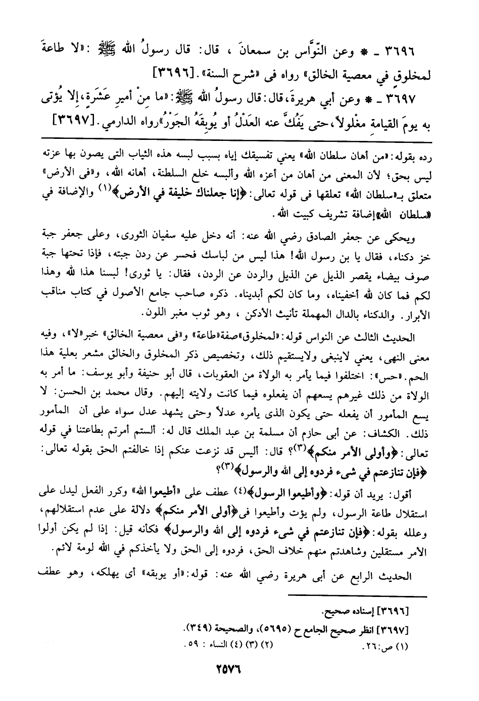 3696 - وعن النواس بن سمعان، قال: قال رسول الله صلى الله عليه وسلم: ((لا طاعة لمخلوق في معصية الخالق)) رواه في ((شرح السنة)). [3696]