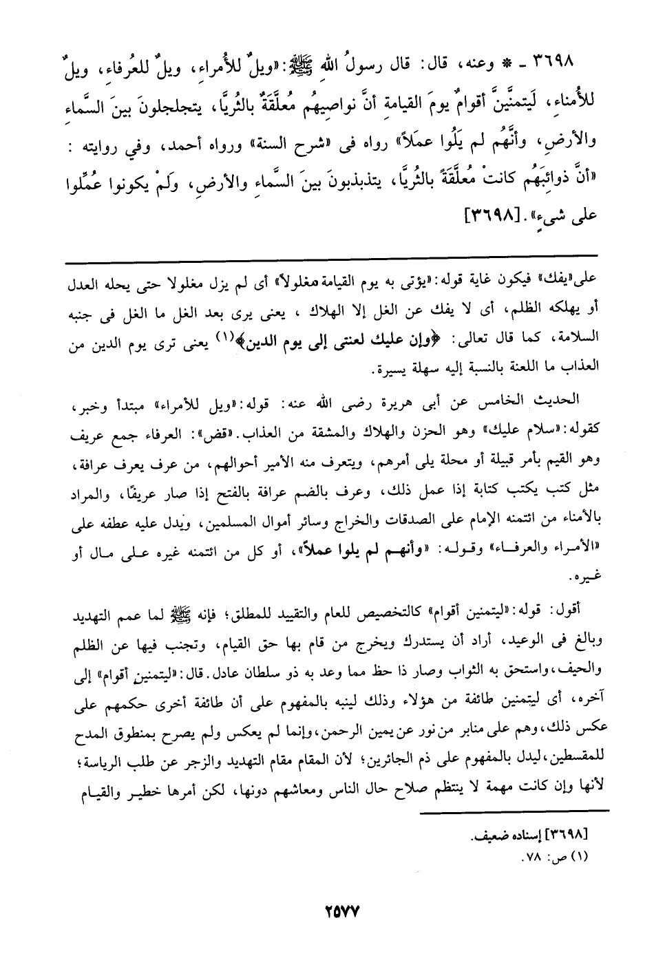 3698 - وعنه، قال: قال رسول الله صلى الله عليه وسلم: ((ويل للأمراء، ويل للعرفاء، ويل للأمناء، ليتمنين أقوام يوم القيامة أن نواصيهم معلقة بالثريا، يتجلجلون بين السماء والأرض، وأنهم لم يلوا عملاً)) رواه في ((شرح السنة)) ورواه أحمد، في روايته: ((أن ذوائبهم كانت معلقة بالثريا، يتذبذبون بين السماء والأرض، ولم يكونوا عملوا علي شيء)). [3698]