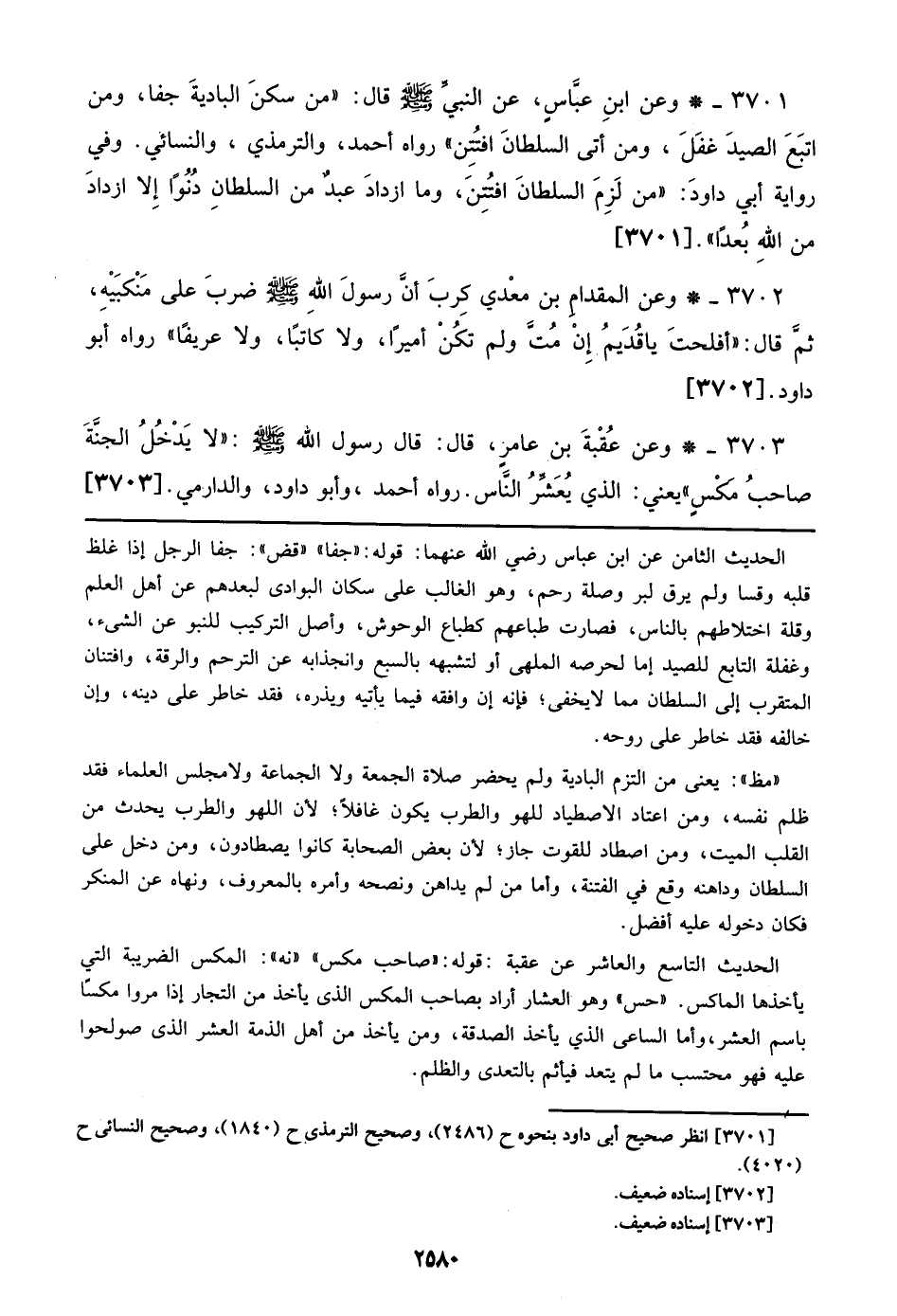3701 - وعن ابن عباس، عن النبي صلى الله عليه وسلم قال: ((من سكن البادية جفا، ومن اتبع الصيد غفل، ومن أتى السلطان افتتن)) رواه أحمدن والترمذي، والنسائي. وفي رواية أبي داود: ((من لزم السلطان افتتن، وما ازداد عبد من السلطان دنوا إلا ازداد من الله بعدا)). [3701]