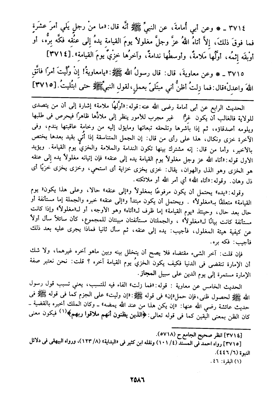 3714 - وعن أبي أمامة, عن النبي صلى الله عليه وسلم أنه قال: ((ما من رجل يلي أمر عشرة فما فوق ذلك, إلا أتاه الله عز وجل مغلولا يوم القيامة يده إلي عنقه فكه بره, أو أوبقه أثمه, أولهما ملامة, وأوسطها ندامة, وآخرها خزي يوم القيامة)). [3714]