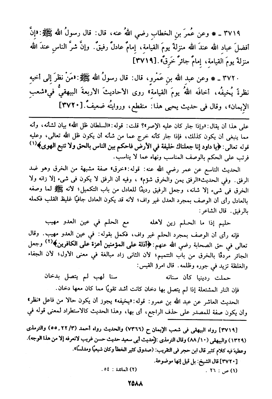3719 - وعن عمر بن الخطاب رضي الله عنه, قال: قال رسول الله صلى الله عليه وسلم: ((إن أفضل عباد الله عند الله منزلة يوم القيامة, إمام عادل رفيق. وإن شر الناس عند الله منزلة يوم القيامة, إمام جائر خرق)). [3719]