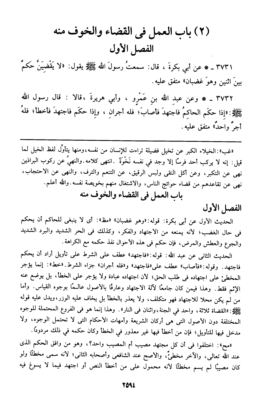 3731 - عن أبي بكرة, قال: سمعت رسول الله صلى الله عليه وسلم يقول: ((لا يقضين حكم بين اثنين وهو غضبان)) متفق عليه.