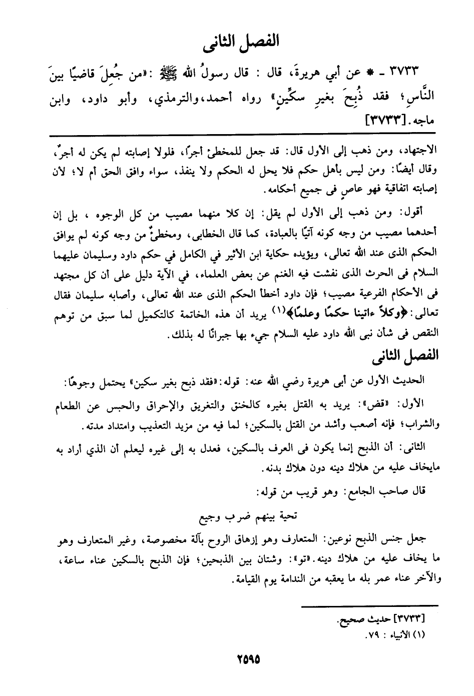 3733 - عن أبي هريرة, قال: قال رسول الله صلى الله عليه وسلم: ((من جعل قاضيا بين الناس؛ فقد ذبح بغير سكين)) رواه أحمد, والترمذي, وأبو داود, وابن ماجه. [3733]