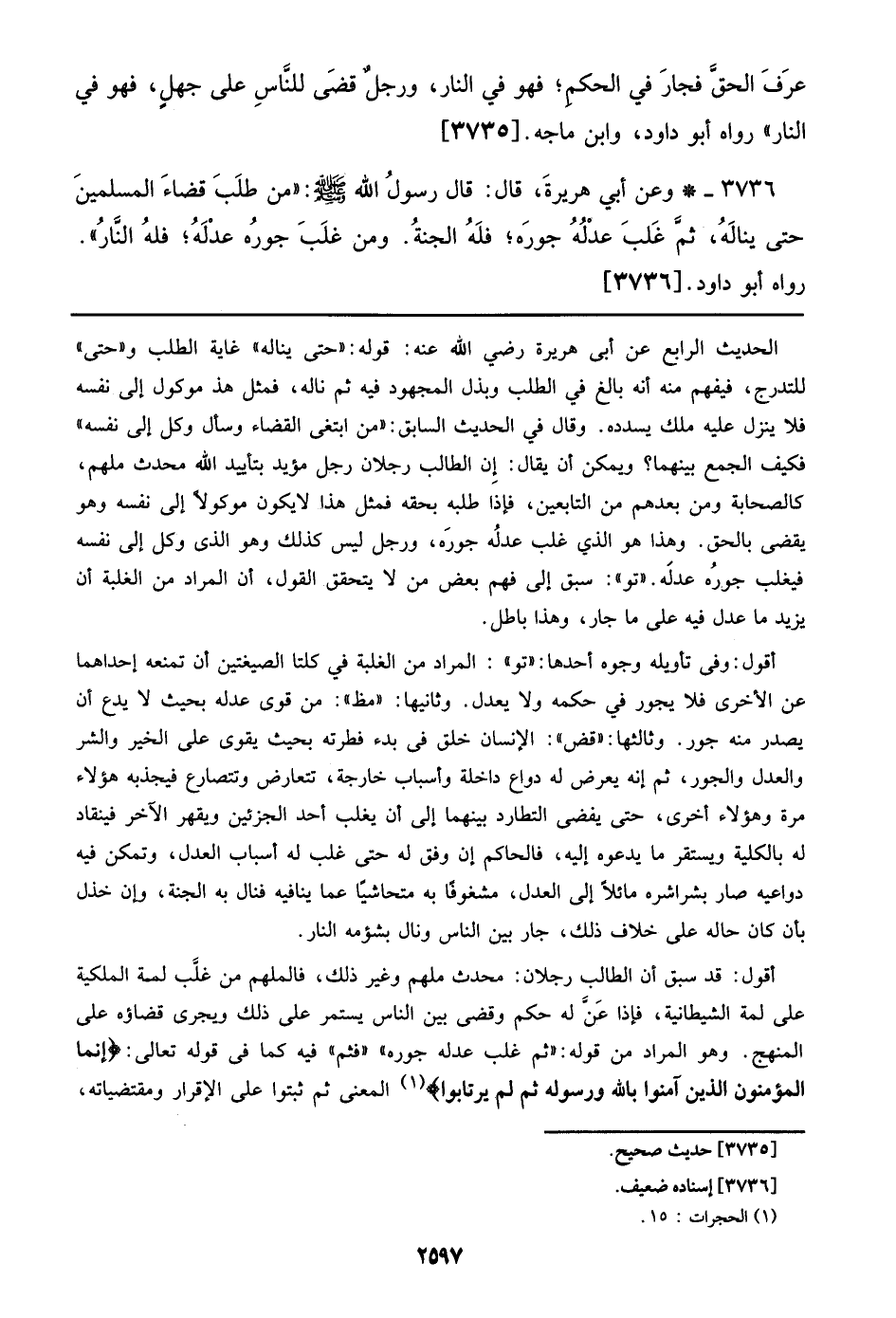 الحديث الرابع عن أبي هريرة رضي الله عنه: قوله: ((حتى يناله)) غاية الطلب و ((حتى)) للتدرج, فيفهم منه أنه بالغ في الطلب وبذل المجهود فيه ثم ناله, فمثل هذ موكول إلي نفسه فلا ينزل عليه ملك يسدده. وقال في الحديث السابق: ((من ابتغى القضاء وسأل وكل إلي نفسه)) فكيف الجمع بينهما؟ ويمكن أن يقال: إن الطالب رجلان رجل مؤيد بتأييد الله محدث ملهم, كالصحابة ومن بعدهم من التابعين, فإذا طلبه بحقه فمثل هذا لا يكون موكلا إلي نفسه وهو يقضي بالحق. وهذا هو الذي غلب عدله جوره, ورجل ليس كذلك وهو الذي وكل إلي نفسه فيغلب جوره عدله. ((تو)): سبق إلي فهم بعض من لا يتحقق القول, أن المراد من الغلبة أن يزيد ما عدل فيه علي ما جار, وهذا باطل.