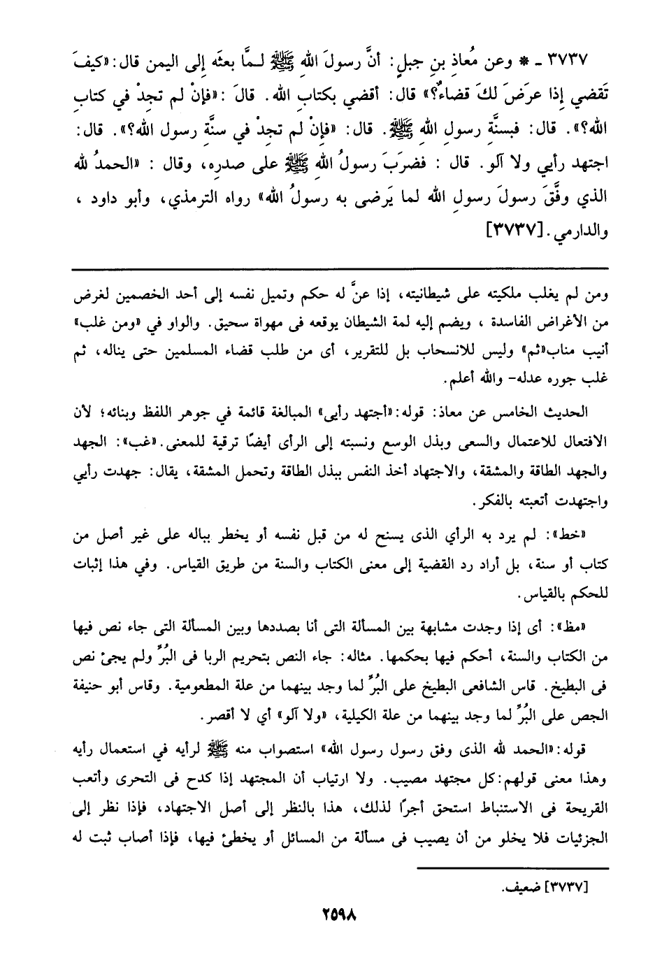 3737 - وعن معاذ بن جبل: أن رسول الله صلى الله عليه وسلم لما بعثه إلي اليمن قال: ((كيف تقضي إذا عرض لك قضاء؟)) قال: أقضي بكتاب الله. قال: ((فإن لم تجد في كتاب الله؟)). قال: فبسنة رسول الله صلى الله عليه وسلم. قال: ((فإن لم تجد في سنة رسول الله؟)). قال: اجتهد رأي ولا آلو. قال: فضرب رسول الله صلى الله عليه وسلم علي صدره, وقال: ((الحمد لله الذي وفق رسول رسول الله لما يرضي به رسول الله)) رواه الترمذي, وأبو داود، والدارمي. [3737]