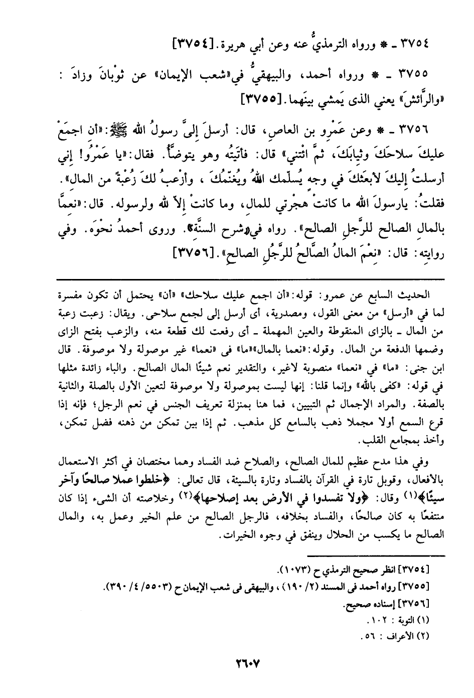 3756 - وعن عمرو بن العاص, قال: أرسل إلي رسول الله صلى الله عليه وسلم: ((أن اجمع عليك سلاحك وثيابك, ثم ائتني)) قال: فأتيته وهو يتوضأ. فقال: ((يا عمرو! إني أرسلت إليك لأبعثك في وجه يسلمك الله ويغنمك, وأزغب لك زغبة من المال)). فقلت: يا رسول الله ما كانت هجرتي للمال, وما كانت إلا لله ولرسوله. قال: ((نعما بالمال الصالح للرجل الصالح)). رواه في (شرح السنة)). وروى أحمد نحوه. وفي روايته: قال: ((نعم المال الصالح للرجل الصالح)). [3756]