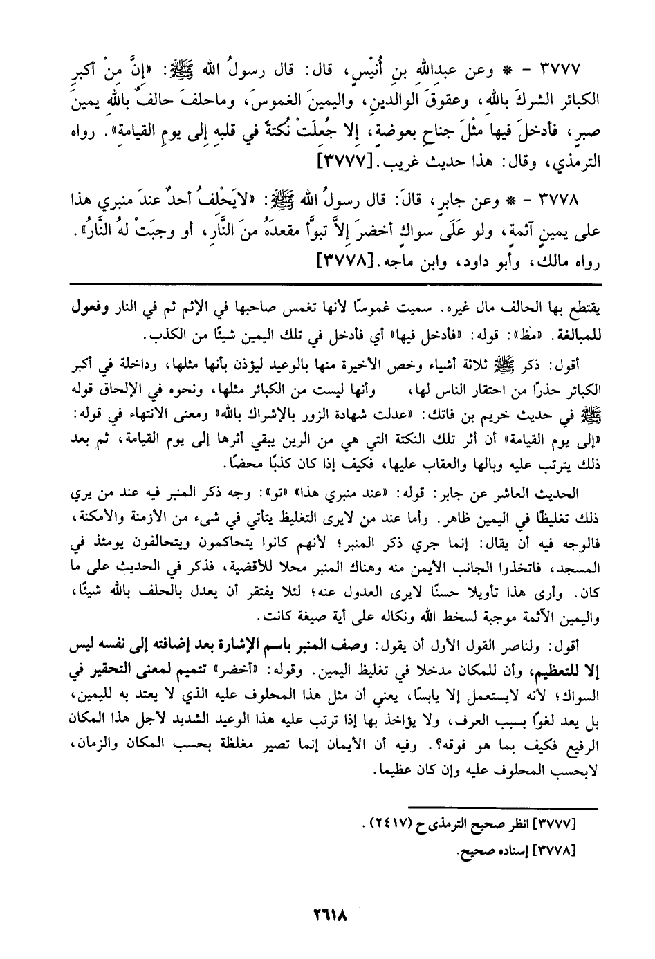 3777 - وعن عبد الله بن إنيس, قال: قال رسول الله صلى الله عليه وسلم: ((إن من أكبر الكبائر الشرك بالله, وعقوق الوالدين, واليمين الغموس, وما حلف حالف بالله يمين صبر, فأدخل فيها مثل جناح بعوضة, إلا جعلت نكتة في قلبه إلي يوم القيامة)). رواه الترمذي, وقال: هذا حديث غريب. [3777]