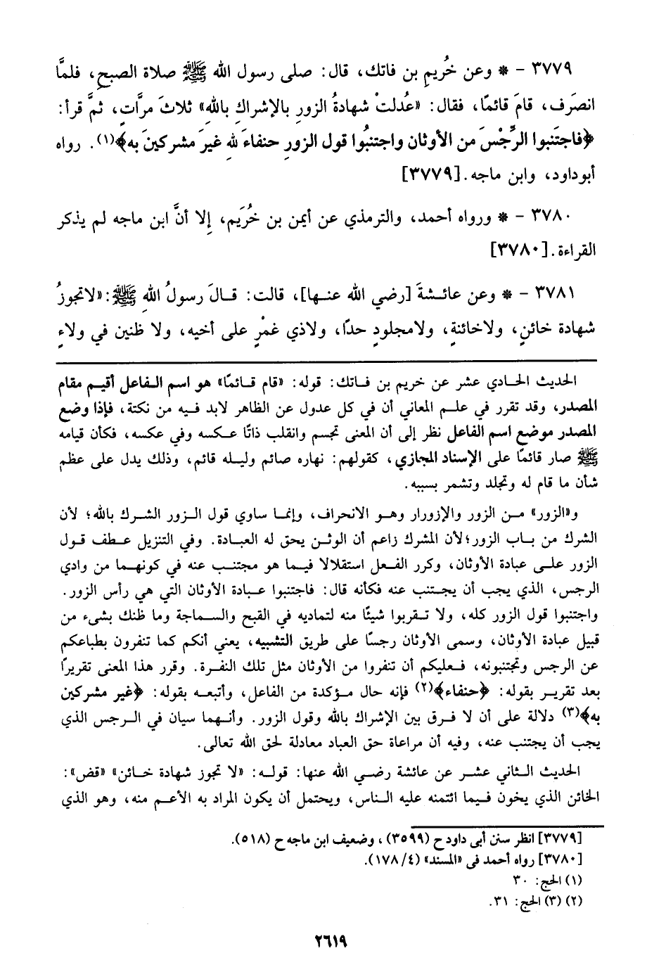 3779 - وعن خريم بن فاتك, قال: صلي رسول الله صلى الله عليه وسلم صلاة الصبح, فلما انصرف, قام قائما, فقال: ((عدلت شهادة الزور بالإشراك بالله)) ثلاث مرات, ثم قرأ: {فَاجْتَنِبُوا الرِّجْسَ مِنَ الأَوْثَانِ وَاجْتَنِبُوا قَوْلَ الزُّورِ حُنَفَاءَ لله غَيْرَ مُشْرِكِينَ} رواه أبو داود, وابن ماجه. [3779]