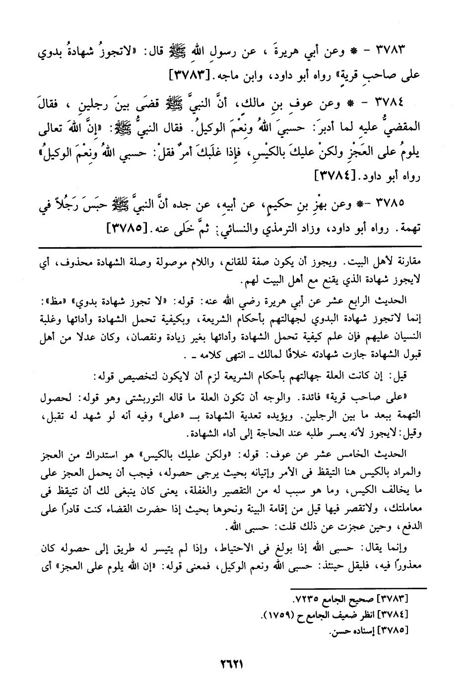 3784 - وعن عوف بن مالك، أن النبي صلى الله عليه وسلم قضى بين رجلين، فقال المقضي عليه لما أدبر: حسبي الله ونعم الوكيل. فقال النبي صلى الله عليه وسلم: ((إن الله تعالي يلوم علي العجز ولكن عليك بالكيس، فإذا غلبك أمر فقل: حسبي الله ونعم الوكيل)) رواه أبو داود. [3784]
