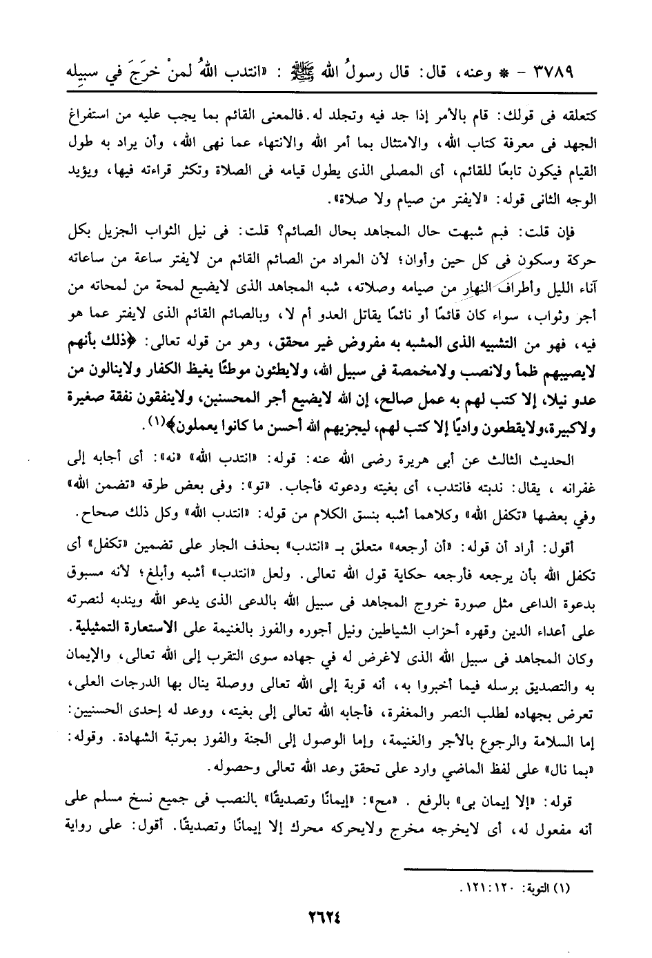 أقول: أراد أن قوله: ((أن أرجعه)) متعلق بـ ((انتدب)) بحذف الجار علي تضمين ((تكفل)) أي تكفل الله بأن يرجعه فأرجعه حكاية قول الله تعالي. ولعل ((انتدب)) أشبه وأبلغ؛ لأنه مسبوق بدعوة الداعي مثل صورة خروج المجاهد في سبيل الله بالدعي الذي يدعو الله ويندبه لنصرته علي أعداء الدين وقهره أحزاب الشياطين ونيل أجوره والفوز بالغنيمة علي الاستعارة التمثيلية. وكان المجاهد في سبيل الله الذي لا غرض له في جهاده سوى التقرب إلي الله تعالي، والإيمان به والتصديق برسله فيما أخبروا به، أنه قربة إلي الله تعالي ووصلة ينال بها الدرجات العلي، تعرض بجهاده لطلب النصر والمغفرة، فأجابه الله تعالي إلي بغيته، ووعد له إحدى الحسنيين: إما السلامة والرجوع بالأجر والغنيمة، وإما الوصول إلي الجنة والفوز بمرتبة الشهادة. وقوله: ((بما نال)) علي لفظ الماضي وأرد علي تحقق وعد الله تعالي وحصوله.