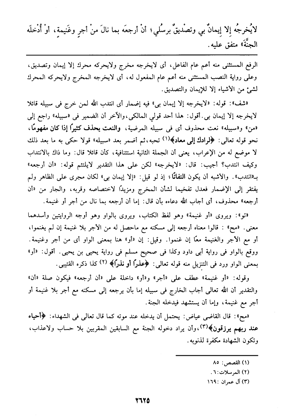 ((شف)): قوله: ((لا يخرجه إلا إيمان بي)) فيه إضمار أي انتدب الله لمن خرج في سبيله قائلا لا يخرجه إلا إيمان بي. أقول: هذا أحد قولي المالكي، والآخر أن الضمير في ((سبيله)) راجع إلي ((من)) و ((سبيله)) نعت محذوف أي في سبيله المرضية، والنعت يحذف كثيرا إذا كان مفهوما، نحو قوله تعالي: {لَرَادُّكَ إلي مَعَادٍ} تحبه، ثم أضمر بعد ((سبيله)) قولا حكى به ما بعد ذلك لا موضع له من الإعراب، يعني أن الجملة الثانية استئنافية، كأن قائلا قال: وما ذاك بالانتداب وكيف انتدب؟ أجيب: قال: ((لا يخرجه)) لكن علي هذا التقدير لا يلتئم قوله: ((أن أرجعه)) بـ ((انتدب)). والأشبه أن يكون التفاتا؛ إذ لو قيل: ((إلا إيمان بي)) لكان مجرى علي الظاهر ولم يفتقر إلي الإضمار فعدل تفخيما لشأن المخرج ومزيدا لاختصاصه وقربه، والجار من ((أن أرجعه)) محذوف، أي أجاب الله دعاءه بأن قال: إما أن أرجعه بما نال من أجر أو غنيمة.