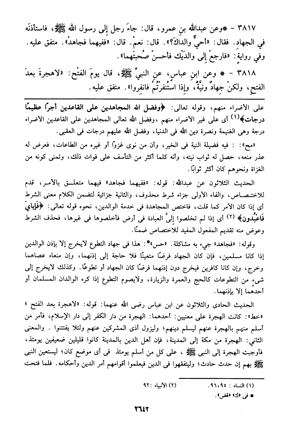 3818 - وعن ابن عباس، عن النبي صلى الله عليه وسلم، قال يوم الفتح: ((لا هجرة بعد الفتح، ولكن جهاد ونية، وإذا استنفرتم فانفروا)). متفق عليه.