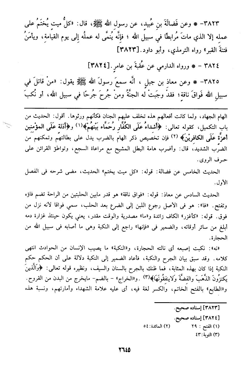 3825 - وعن معاذ بن جبل، أنه سمع رسول الله صلى الله عليه وسلم يقول: ((من قاتل في سبيل الله فواق ناقة؛ فقد وجبت له الجنة ومن جرح جرحا في سبيل الله، أو نكب