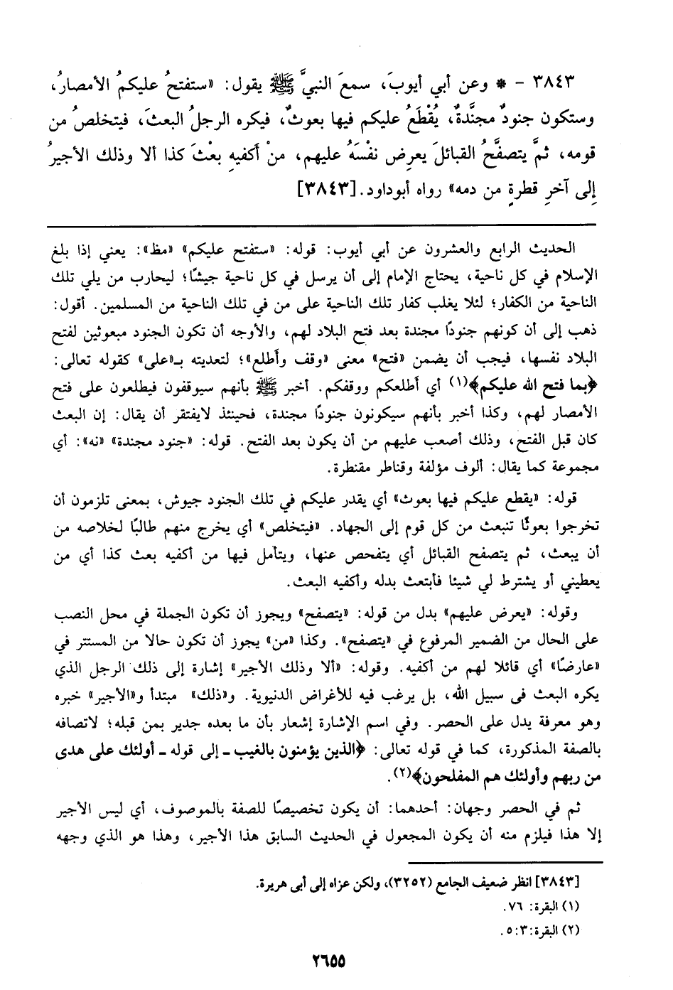 الحديث الرابع والعشرون عن أبي أيوب: قوله: ((ستفتح عليكم)) ((مظ)): يعني إذا بلغ الإسلام في كل ناحية، يحتاج الإمام إلي أن يرسل في كل ناحية جيشا؛ ليحارب من يلي تلك الناحية من الكفار؛ لئلا يغلب كفار تلك الناحية علي من في تلك الناحية من المسلمين. أقول: ذهب إلي أن كونهم جنودا مجندة بعد فتح البلاد لهم، والأوجه أن تكون الجنود مبعوثين لفتح البلاد نفسها، فيجب أن يضمن ((فتح)) معنى ((وقل وأطلع))؛ لتعديته بـ ((علي)) كقوله تعالي: {بِمَا فَتَحَ اللَّهُ عَلَيْكُمْ} أي أطلعكم ووفقكم. أخبر صلى الله عليه وسلم بأنهم سيوقفون فيطلعون علي فتح الأمصار لهم، وكذا أخبر بأنهم سيكونون جنودا مجندة، فحينئذ لا يفتقر أن يقال: إن البعث كان قبل الفتح، وذلك أصعب عليهم من أن يكون بعد الفتح. قوله: ((جنود مجندة)) ((نه)): أي مجموعة كما يقال: ألوف مؤلفة وقناطر مقنطرة.