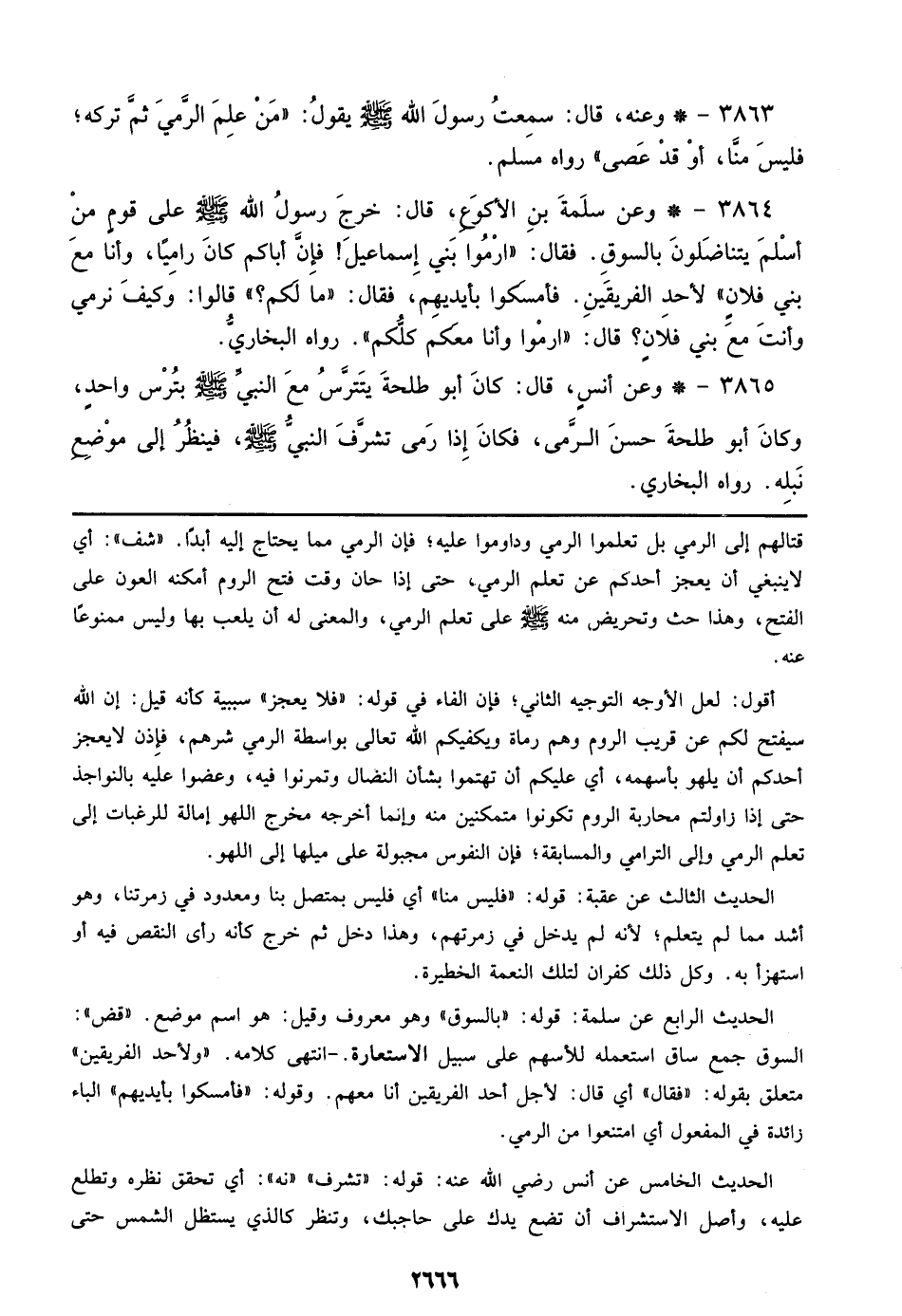 قتالهم إلي الرمي بل تعلموا الرمي وداوموا عليه؛ فإن الرمي مما يحتاج إليه أبدا. ((شف)): أي لا ينبغي أن يعجز أحدكم عن تعلم الرمي، حتى إذا حان وقت فتح الروم أمكنه العون علي الفتح، وهذا حث وتحريض منه صلى الله عليه وسلم علي تعلم الرمي، والمعنى له أن يلعب بها وليس ممنوعا عنه.