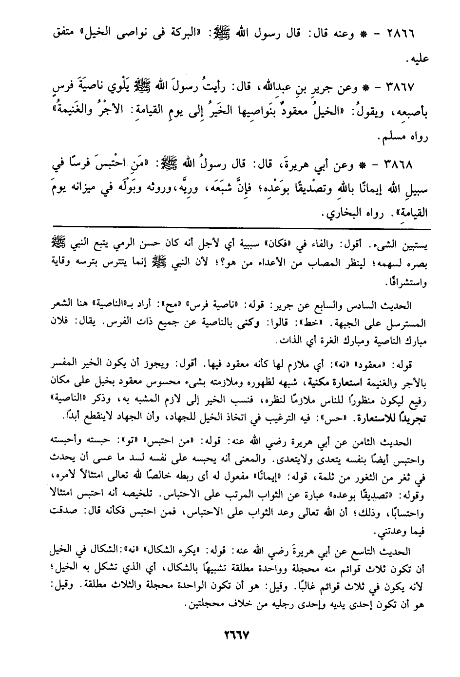 3867 - وعن جرير بن عبد الله، قال: رأيت رسول الله صلى الله عليه وسلم يلوي ناصية فرس بأصبعه، ويقول: ((الخيل معقود بنواصيها الخير إلي يوم القيامة: الأجر والغنيمة)) رواه مسلم.