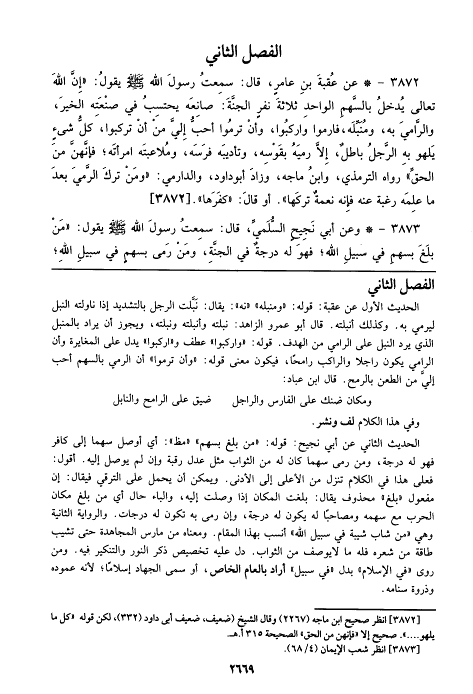 3872 - عن عقبة بن عامر، قال: سمعت رسول الله صلى الله عليه وسلم يقول: ((إن الله تعالي يدخل بالسهم الواحد ثلاثة نفر الجنة: صانعه يحتسب في صنعته الخير، والرامي به، ومنبله، فارموا واركبوا، وأن ترموا أحب الي من أن تركبوا، كل شيء يلهو به الرجل باطل، إلا رميه بقوسه، وتأديبه فرسه، وملاعبته امرأته؛ فإنهن من الحق)) رواه الترمذي، وابن ماجه، وزاد أبو داود، والدارمي: ((ومن ترك الرمي بعد ما علمه رغبة عنه فإنه نعمة تركها)). أو قال: ((كفرها)). [3872]
