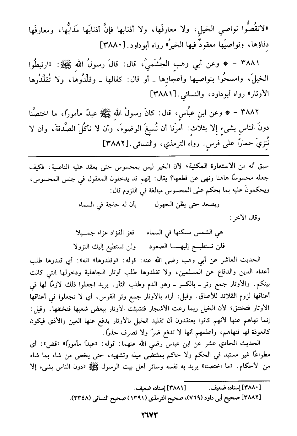 3881 - وعن أبي وهب الجشمي، قال: قال رسول الله صلى الله عليه وسلم: ((ارتبطو الخيل، وامسحوا بنواصيها وأعجازها – أو قال: كفالها – وقلدوها، ولا تقلدوها الأوتار)) رواه أبو داود، والنسائي. [3881]