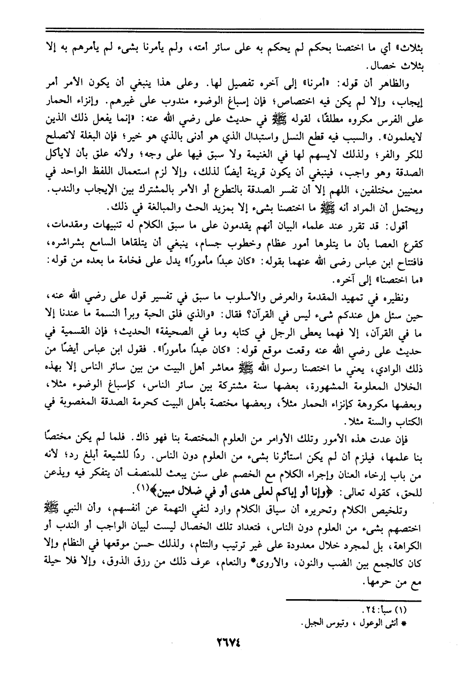 فإن عدت هذه الأمور وتلك الأوامر من العلوم المختصة بنا فهو ذاك. فلما لم يكن مختصا بنا علمها، فيلزم أن لم يكن استأثرنا بشيء من العلوم دون الناس. ردا للشيعة أبلغ رد؛ لأنه من باب إرخاء العنان وإجراء الكلام مع الخصم علي سنن يبعث للمنصف أن يتفكر فيه ويذعن للحق، كقوله تعالي: {وَإنَّا أَوْ إيَّاكُمْ لَعَلي هُدًى أَوْ فِي ضَلالٍ مُّبِينٍ}.