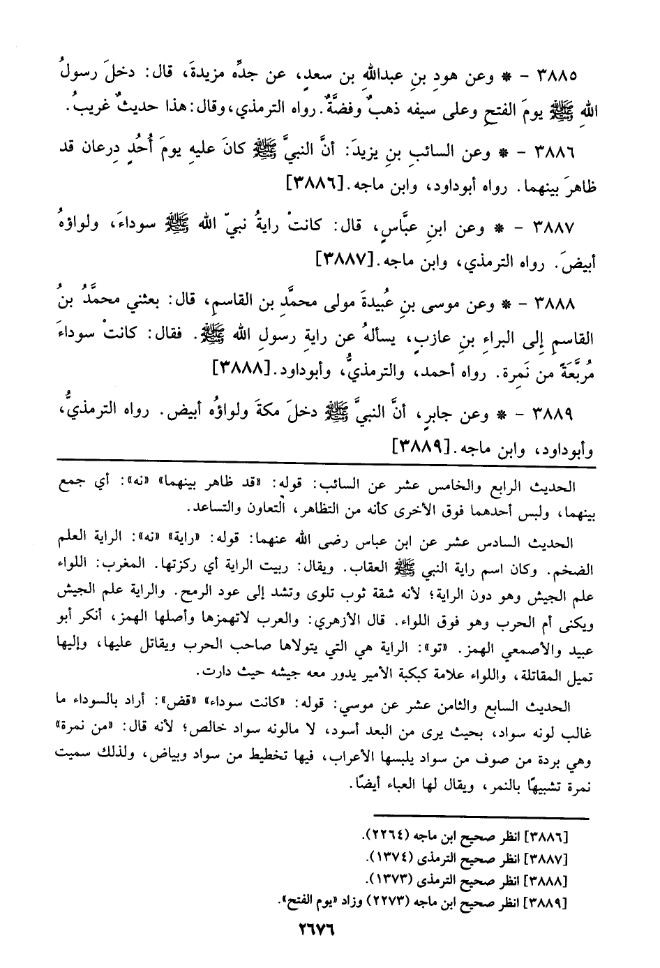 3885 - وعن هود بن عبد الله بن سعد، عن جده مزيدة، قال: دخل رسول الله صلى الله عليه وسلم يوم الفتح وعلي سيفه ذهب وفضة. رواه الترمذي، وقال: هذا حديث غريبز