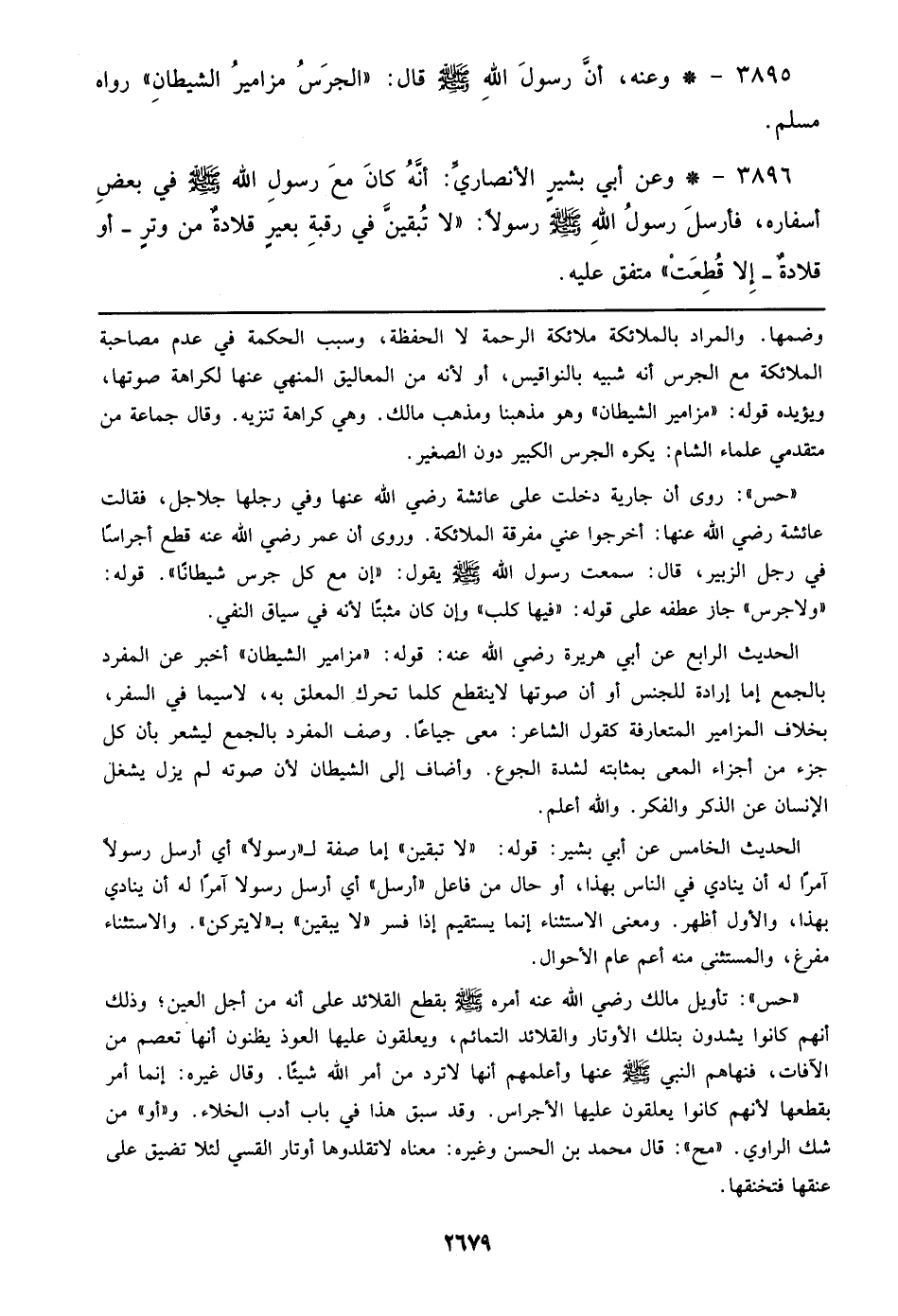 الحديث الرابع عن أبي هريرة رضي الله عنه: قوله: ((مزامير الشيطان)) أخبر عن المفرد بالجمع إما إرادة للجنس أو أن صوتها لا ينقطع كلما تحرك المعلق به، لا سيما في السفر، بخلاف المزامير المتعارفة كقول الشاعر: معي جياعا. وصف المفرد بالجمع ليشعر بأن كل جزء من أجزاء المعي بمثابته لشدة الجوع. وأضاف إلي الشيطان لأن صوته لم يزل يشغل الإنسان عن الذكر والفكر. والله أعلم.