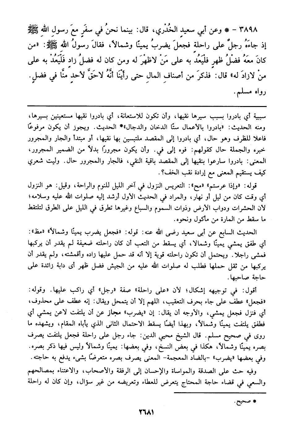3898 - وعن أبي سعيد الخدري، قال: بينما نحن في سفر مع رسول الله صلى الله عليه وسلم إذا جاءه رجل علي راحلة فجعل يضرب يميناً وشمالاً، فقال رسول الله صلى الله عليه وسلم: ((من كان معه فضل ظهر فليعد به من لا ظهر له ومن كان له فضل زاد فليعد به علي من لا زاد له)) قال: فذكر من أصناف المال حتى رأينا أنه لا حق لأحد منا في فضل. رواه مسلم.