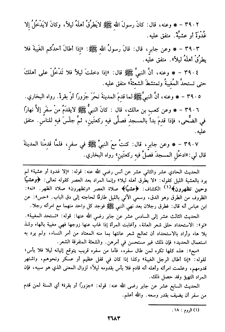 3902 - وعنه، قال: كان رسول الله صلى الله عليه وسلم لا يطرق أهله ليلاً، وكان لا يدخل إلا غدوة أو عشية. متفق عليه.