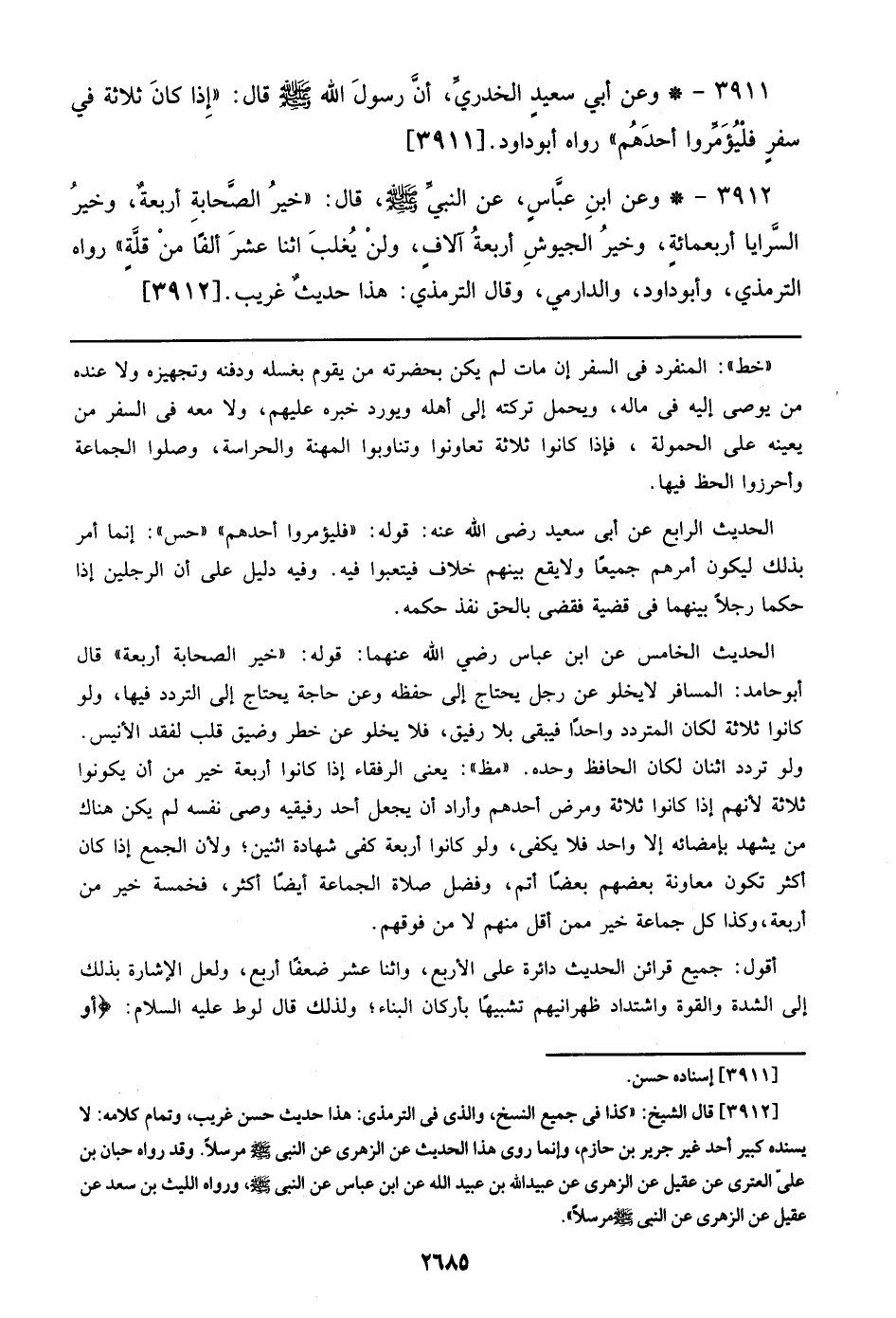 الحديث الخامس عن ابن عباس رضي الله عنهما: قوله: ((خير الصحابة أربعة)) قال أبو حامد: المسافر لا يخلو عن رجل يحتاج إلي حفظه وعن حاجة يحتاج إلي التردد فيها، ولو كانوا ثلاثة لكان المتردد واحداً فيبقى بلا رفيق، فلا يخلو عن خطر وضيق قلب لفقد الإنيس. ولو تردد اثنان لكان الحافظ وحده. ((مظ)): يعني الرفقاء إذا كانوا أربعة خير من أن يكونوا ثلاثة لأنهم إذا كانوا ثلاثة ومرض أحدهم وأراد أن يجعل أحد رفيقيه وصى نفسه لم يكن هناك من يشهد بإمضائه إلا واحد فلا يكفي، ولو كانوا أربعة كفي شهادة اثنين؛ ولأن الجمع إذا كان أكثر تكون معاونة بعضهم بعضاً أتم، وفضل صلاة الجماعة أيضاً أكثر، فخمسة خير من أربعة، وكذا كل جماعة خير ممن أقل منهم لا من فوقهم.