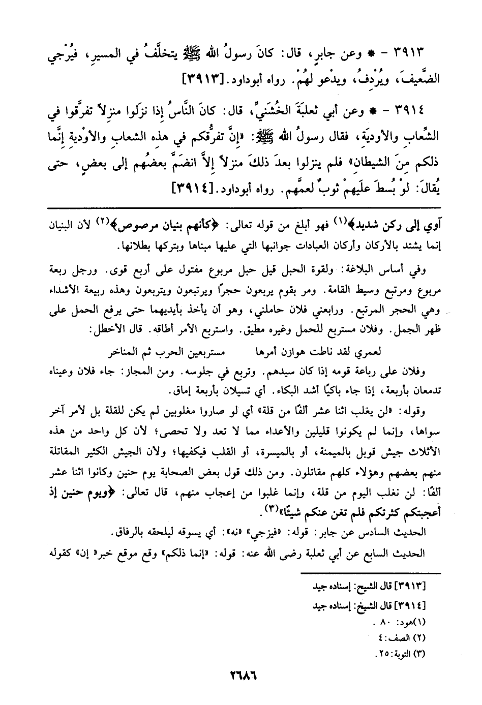 3913 - وعن جابر، قال: كان رسول الله صلى الله عليه وسلم يتخلف في المسر، فيرجي الضعيف، ويردف، ويدعو لهم. رواه أبو داود. [3913]