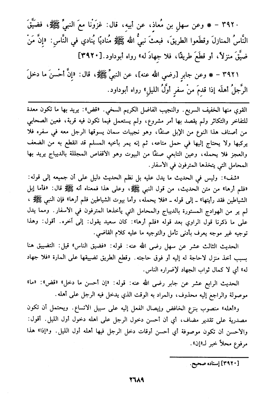 3921 - وعن جابر [رضي الله عنه]، عن النبي صلى الله عليه وسلم، قال: ((إن أحسن ما دخل الرجل أهله إذا قدم من سفر أول الليل)) رواه أبو داود.