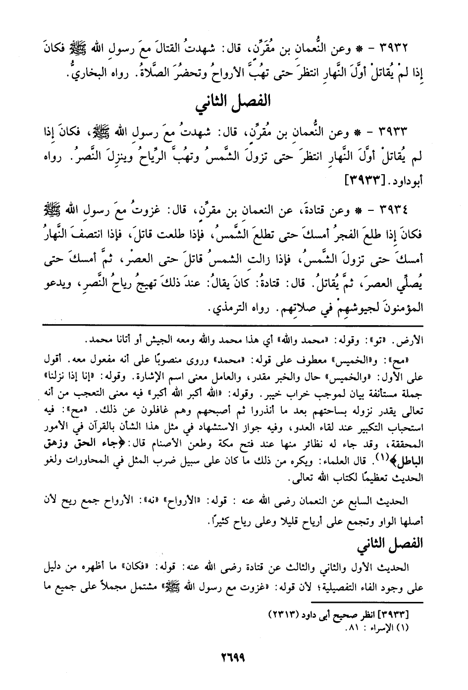 3933 - وعن النعمان بن مقرن، قال: شهدت مع رسول الله صلى الله عليه وسلم، فكان إذا لم يقاتل أول النهار انتظر حتى تزول الشمس وتهب الرياح وينزل النصر. رواه أبو داود. [3933]