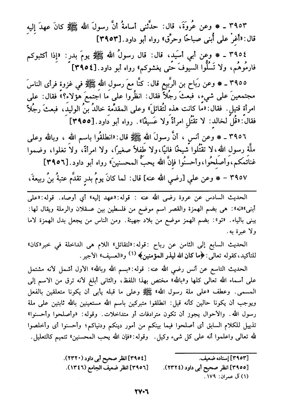3954 - وعن أبي أسيد، قال: قال رسول الله صلى الله عليه وسلم يوم بدر: ((إذا أكثبوكم فأرموهم، ولا تسلوا السيوف حتى يغشوكم)) رواه أبو داود. [3954]